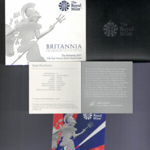 The 2017 Britannia is a coin struck in fine silver by the Royal Mint. The obverse features the fifth crowned portrait of Queen Elizabeth II facing right. The reverse features a standing figure of Britannia with an outline of Great Britain with shield and trident.