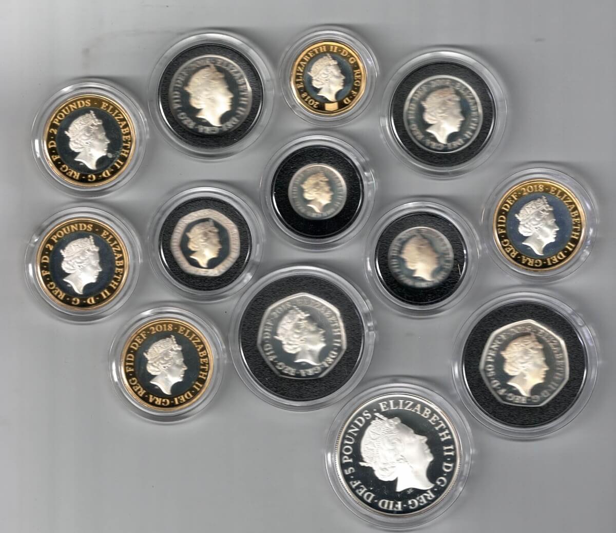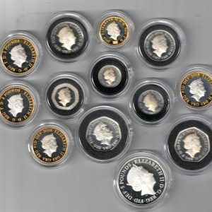 The coins in this set contains the range of UK coins from the 1p to the £5. Each Coin in this collection features the portrait of the Queen Elizabeth II. All coins in this collection have been struck to Proof Quality.