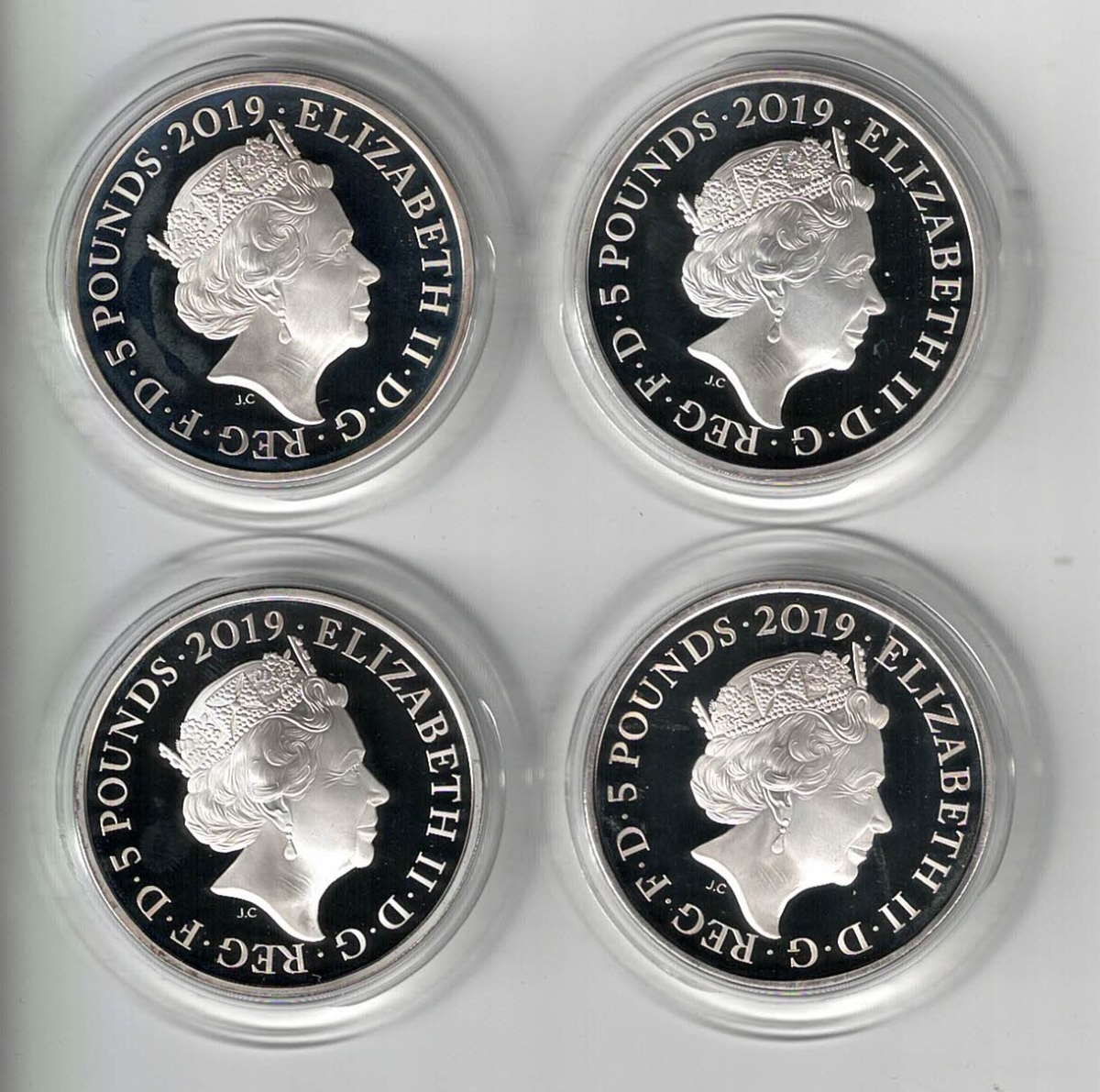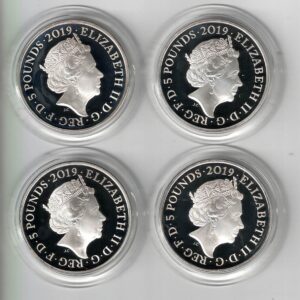 Boxed 2019 Five Pounds Tower Of London Four Coin Standard Silver proof set featuring Queen Elizabeth II on the Obverse. All coins are in stock.Boxed 2019 Five Pounds Silver Proof Tower Of London Set