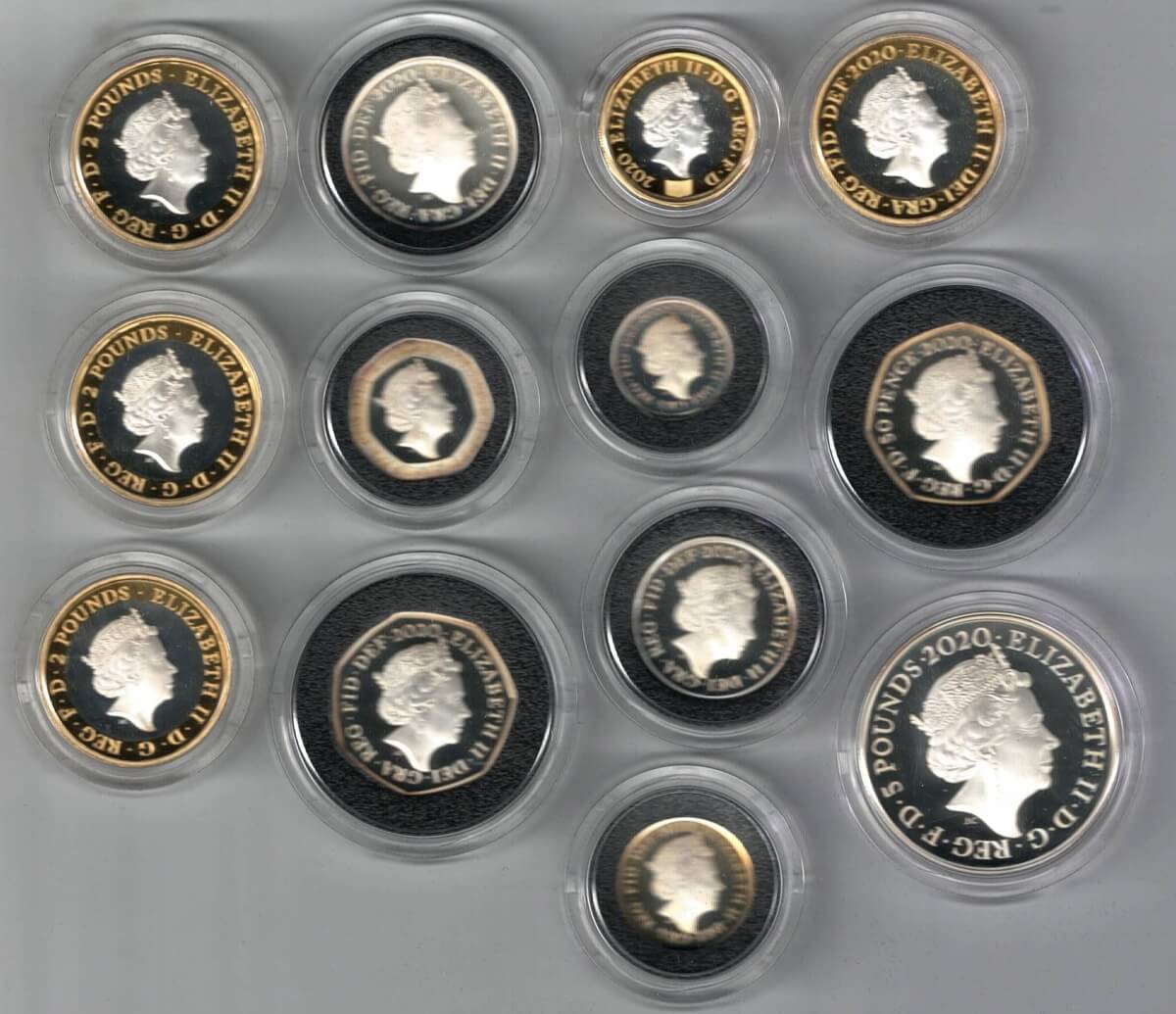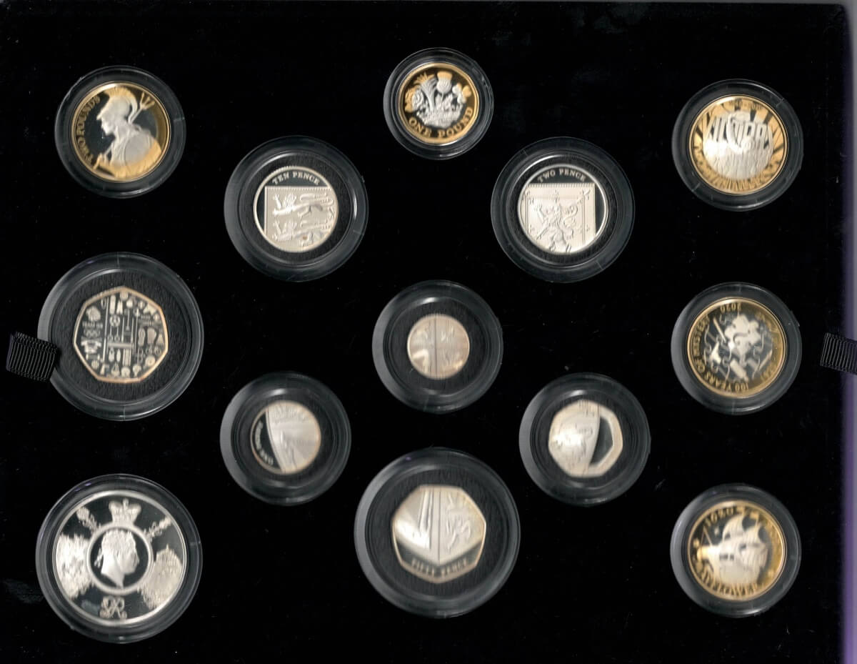 The coins in this set contains the range of UK coins from the 1p to the £5. Each Coin in this collection features the portrait of the Queen Elizabeth II. All coins in this collection have been struck to Proof Quality.