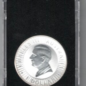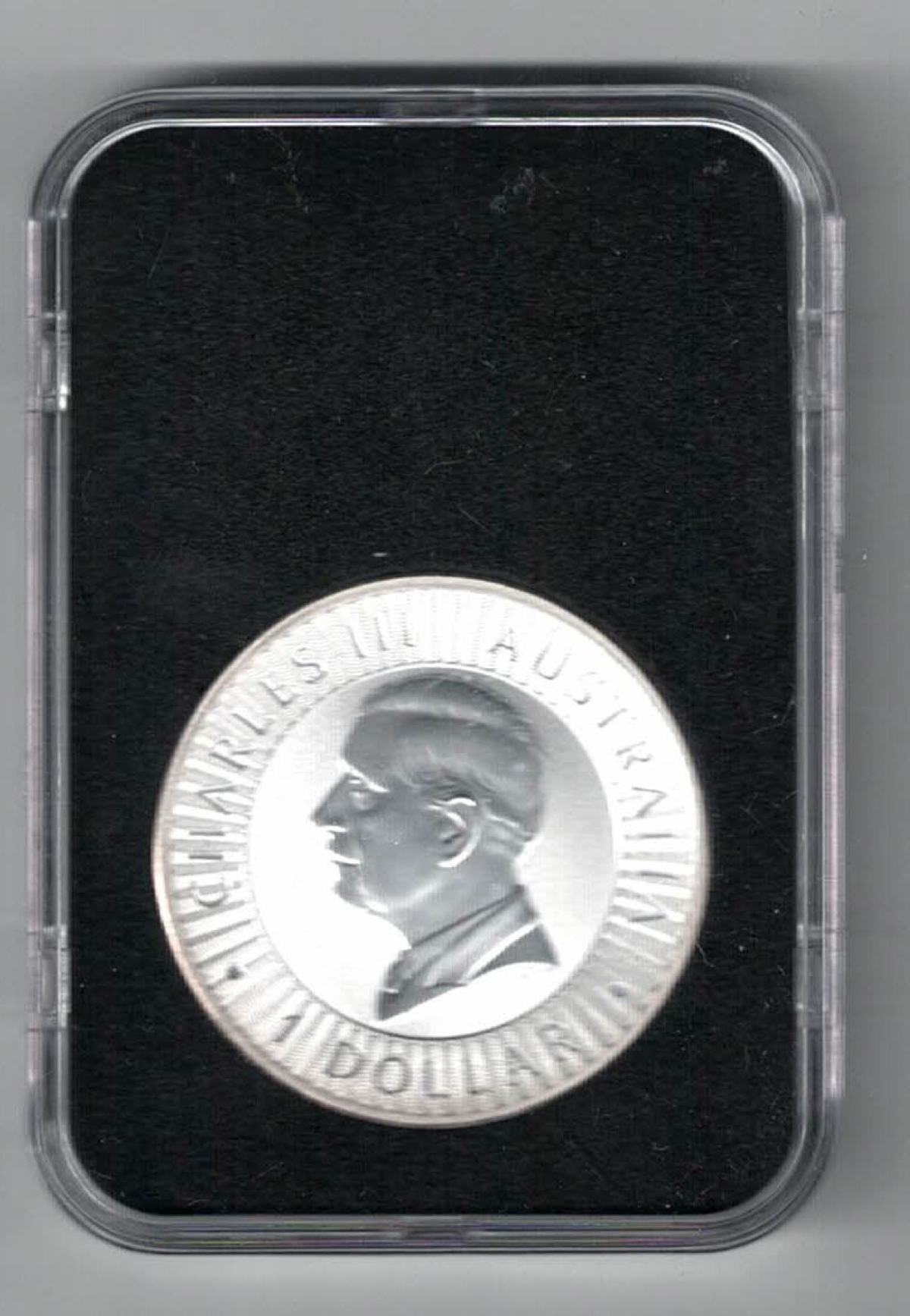 This 2024 coin was struck in fine silver by the Perth Mint . The obverse features Charles III facing Left. The reverse features a kangaroo facing left.