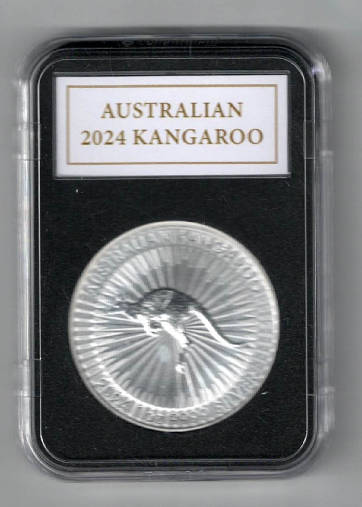 Cased 2024 Silver Australian One Ounce Kangaroo $1 Coin in near mint condition.