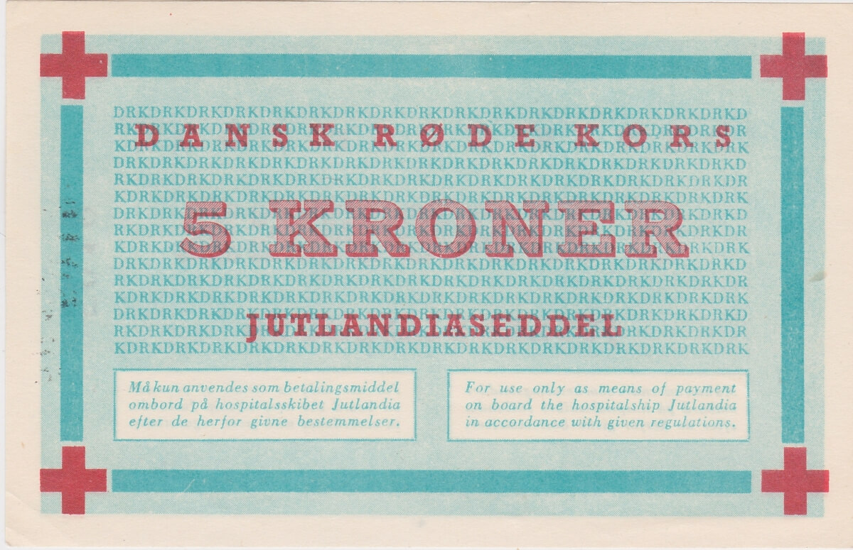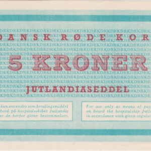 The MS Jutlandia was a ship built for the East Asiatic Company (EAC) in 1934. It was used as a passenger and cargo ship at EAC’s Nakskov Shipyard in Denmark. Also serving as a hospital ship during the Korean War, and a royal yacht for the King of Thailand on his visit to Scandinavia and also the Queen of Denmark. The MS Jutlandia was decommissioned in 1965. During its time as a hospital ship, she provided assistance to the United Nations Command and humanitarian support to the allied forces in South Korea, and she issued shipboard scrip in denominations of 25 Øre, 1 Krone and 5 Kroner.