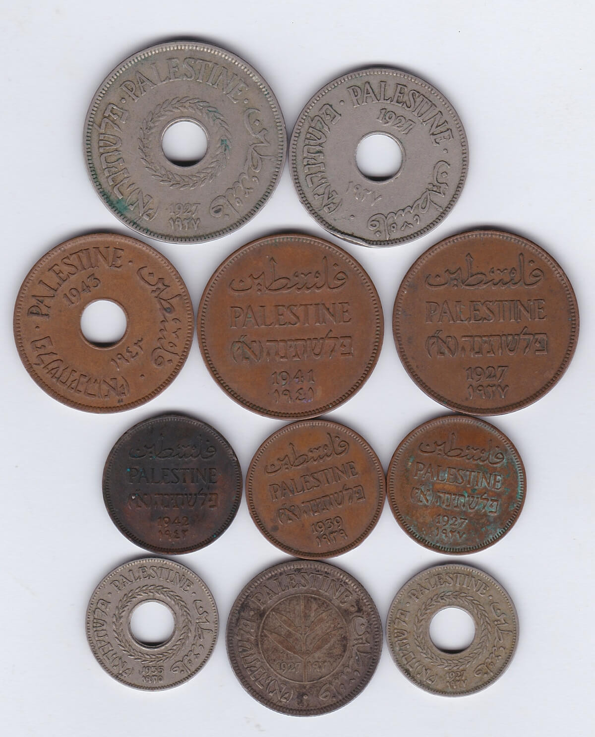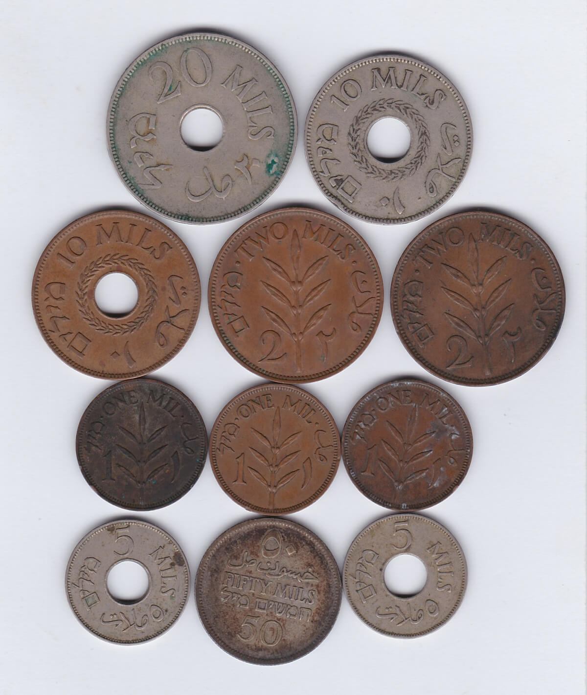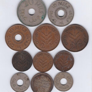 Eleven Palestine Mixed Coins. The Obverse features the word Palestine with the date below. The reverse features the value divided by an olive branch.Eleven Palestine Mixed Coins