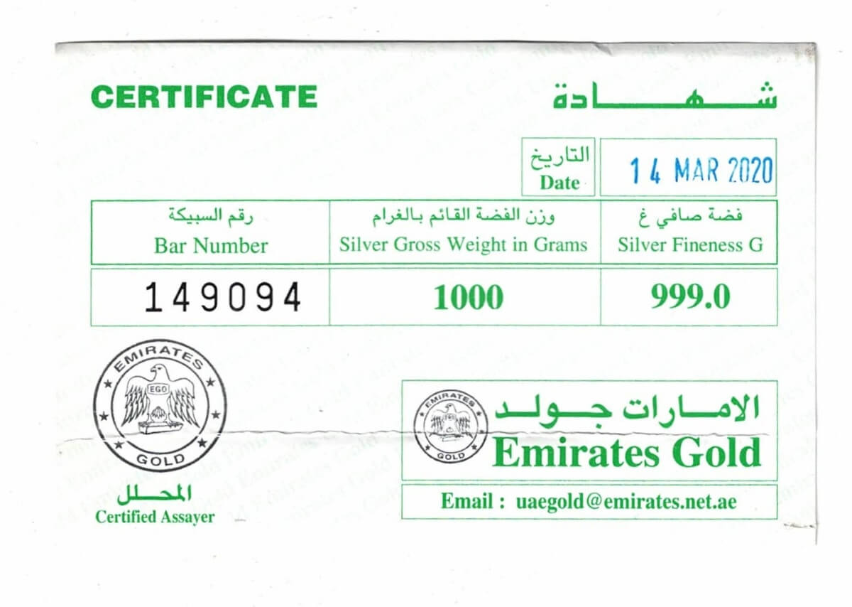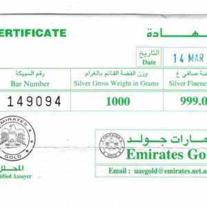 Emirates One Kilo Silver Bar In Near Mint Condition.