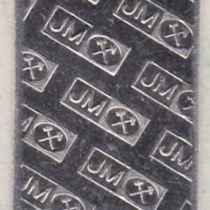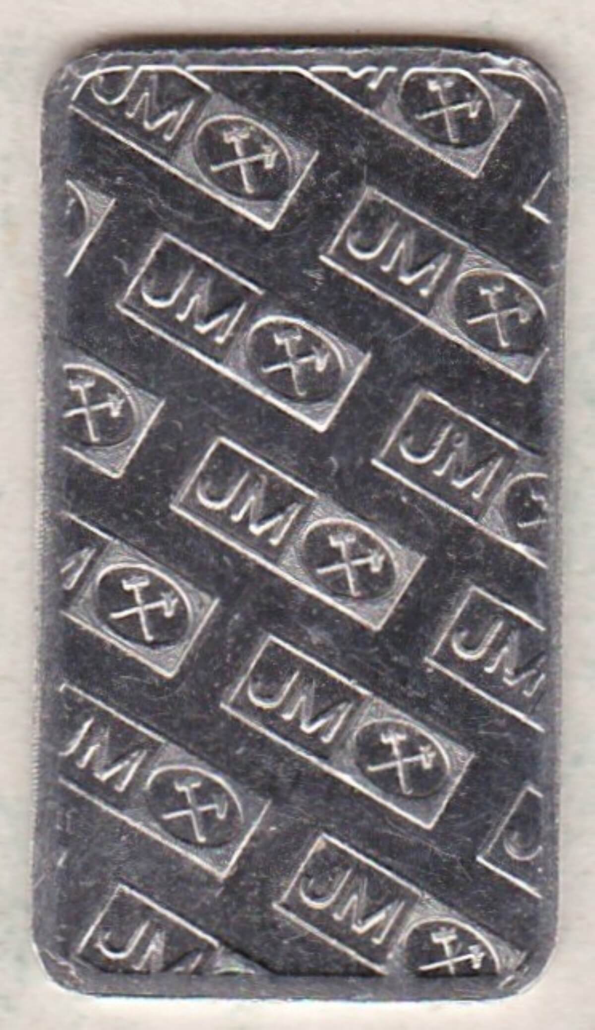 One side of this bar features the Johnson Matthey logo along with the weight and bar fineness. The individual bar number is also at the bottom. The other side of the bar features the Johnson Matthey log.
