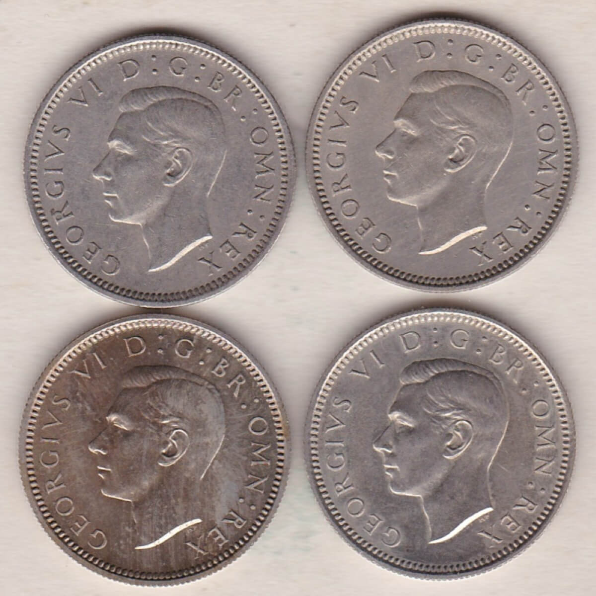 Four 1950 And 1951 George VI Cupro Nickel Sixpence Coins featuring King George VI. The reverse features the crowned royal cypher dividing the date.Four 1950 And 1951 Cupro Nickel Sixpence Coins – George VI
