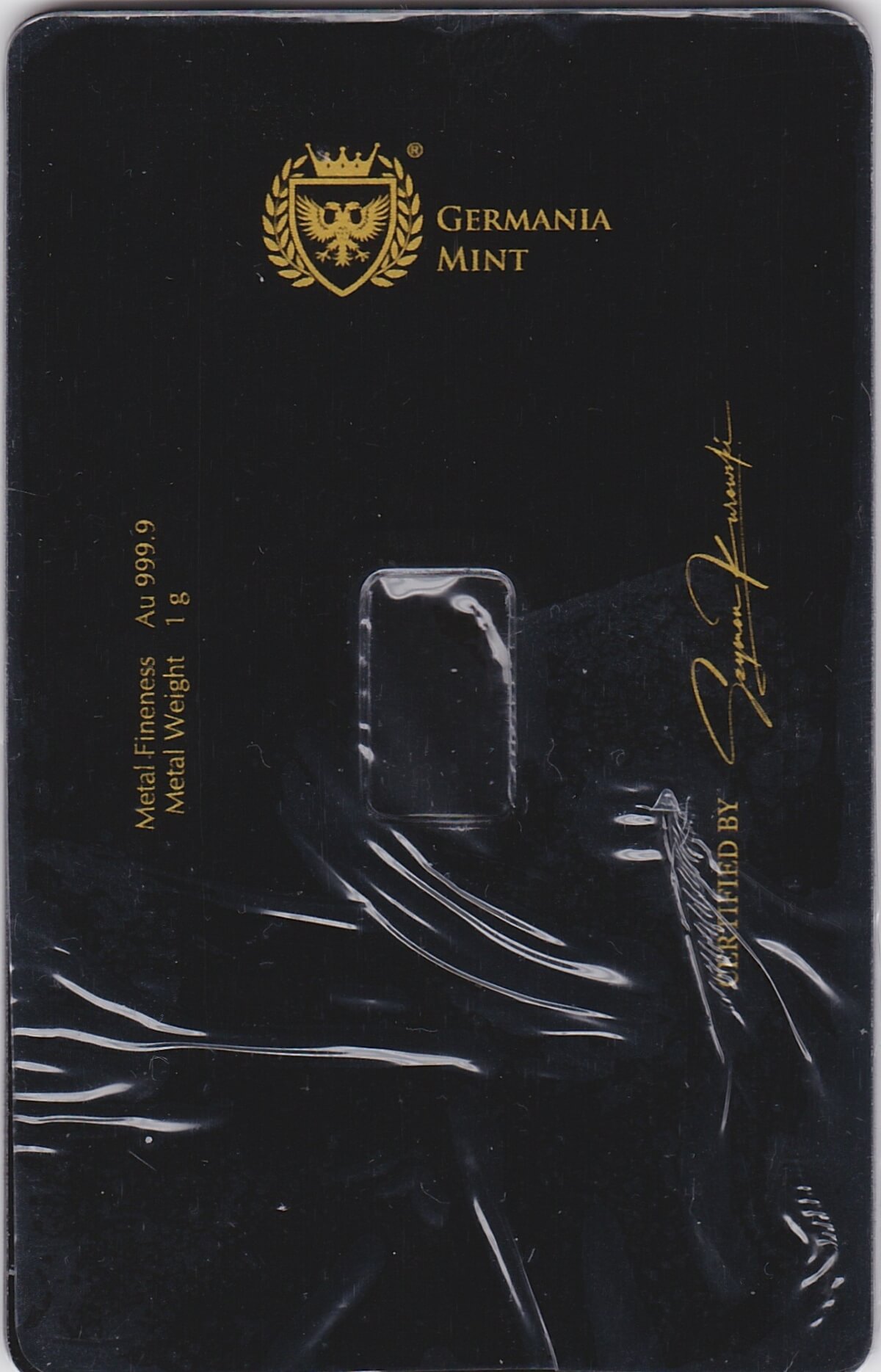 The bar was cast at the Germania Mint and sealed inside a plastic credit card sized holder The gold bar features the weight, gold fineness and Germania Mint logo.