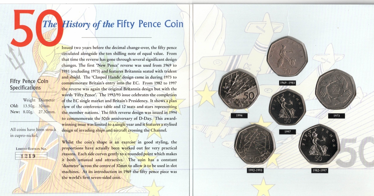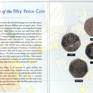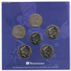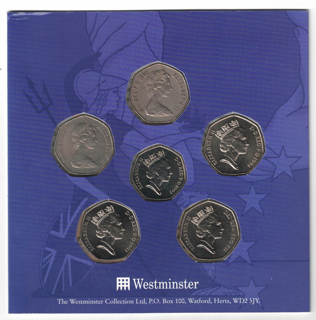 This is a commemorative set which contains Six Fifty Pence pieces. It contains the years 1973, 1980, 1993, 1994 and Two 1997 (One Large and One Small type)