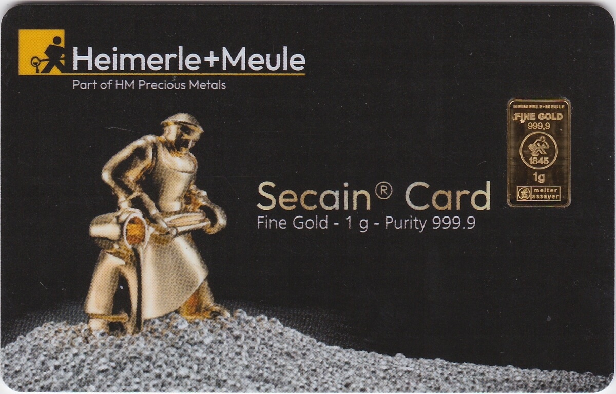 Heimerle + Meule One Gram Gold Bar. This bar contains 1 gram of 999.9 fine gold and comes presented in a plastic credit card sized packet.Heimerle + Meule One Gram Gold Bar