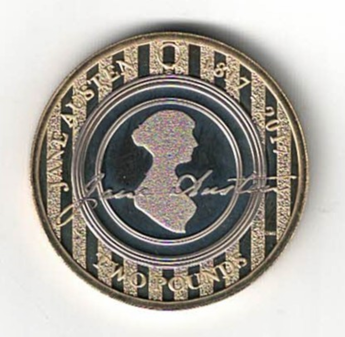 The obverse features the fifth crowned portrait of queen Elizabeth II. The reverse features an outline of Jane Austen.