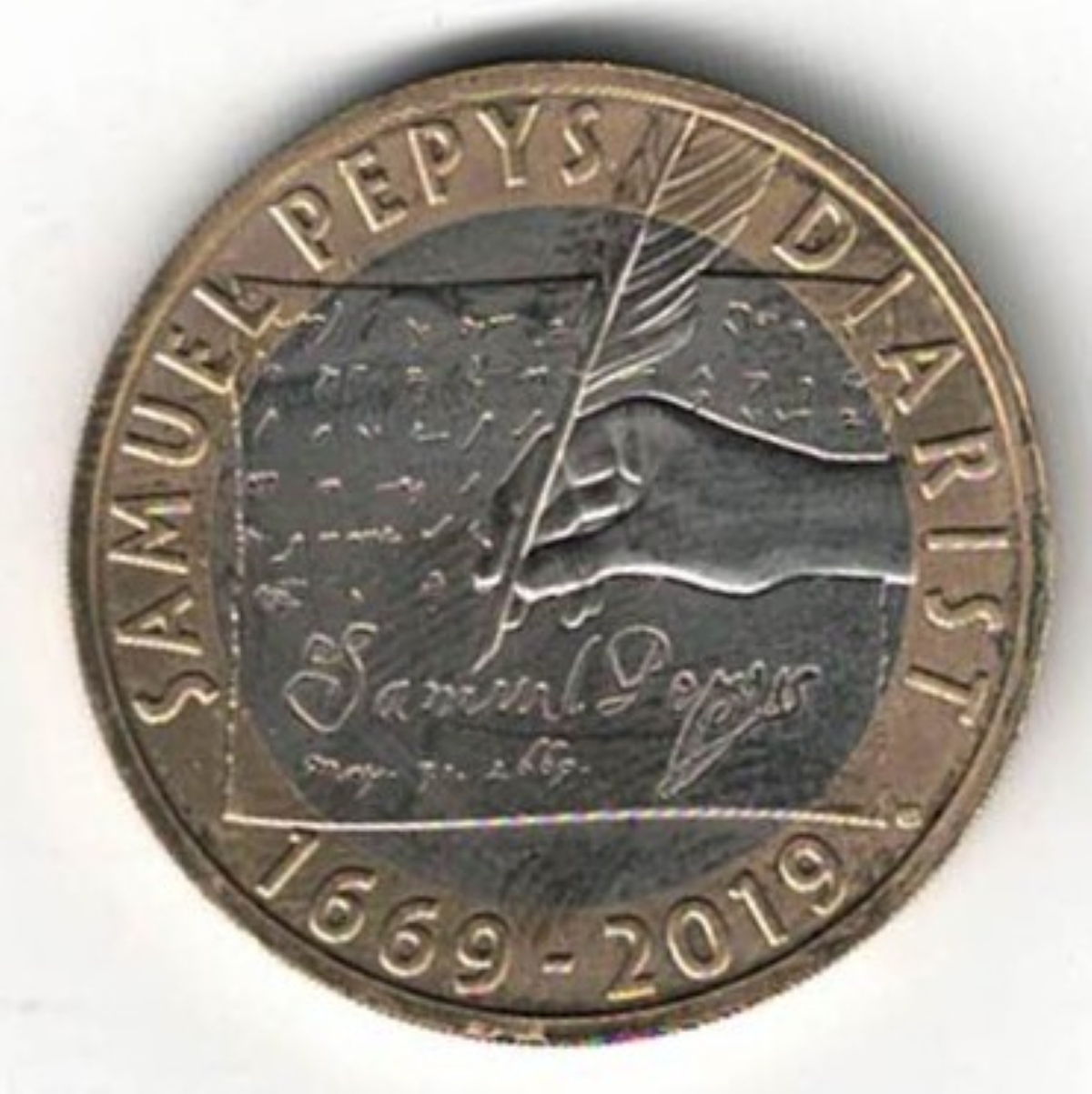The picture is a stock item and you will receive a similar 2019 Samuel Pepys two pound coin.
