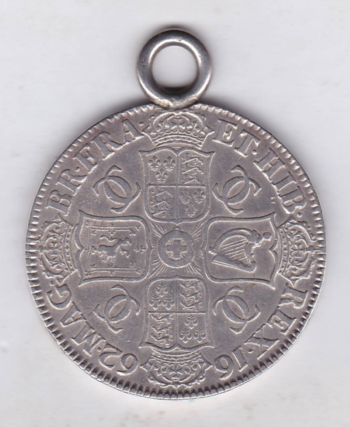 The date and legend are clear and readable. There are surface marks on the obverse and also an engraving 6 / 0 to the left of the rose under the portrait. The coin has a silver ring loop or mount at the top of the coin meant for jewellery purposes.