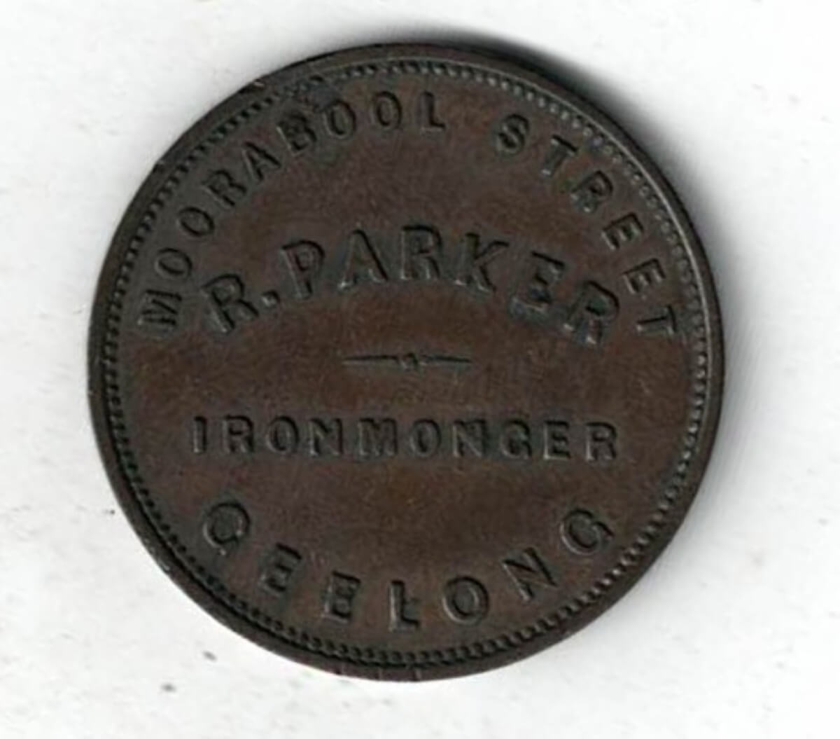 The obverse features text R,Parker, Ironmonger, Geelong, Moorabool Street. The reverse features a figure standing in the sea.