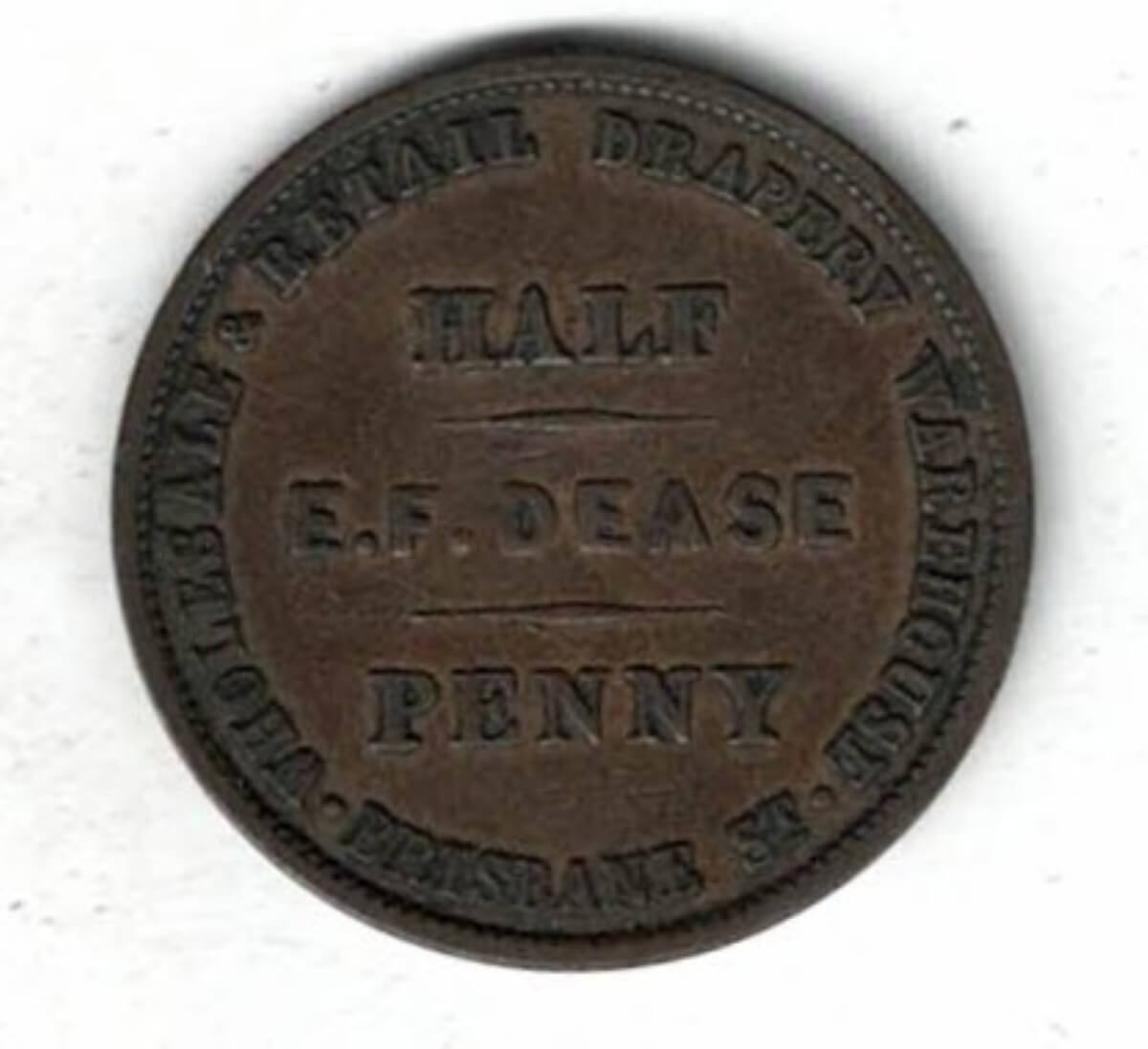 ND 1865 Australia E.F. Dease Copper Half Penny Token. This obverse features the lettering wholesale & retail drapery warehouse.ND 1865 Australia E.F. Dease Copper Half Penny Token