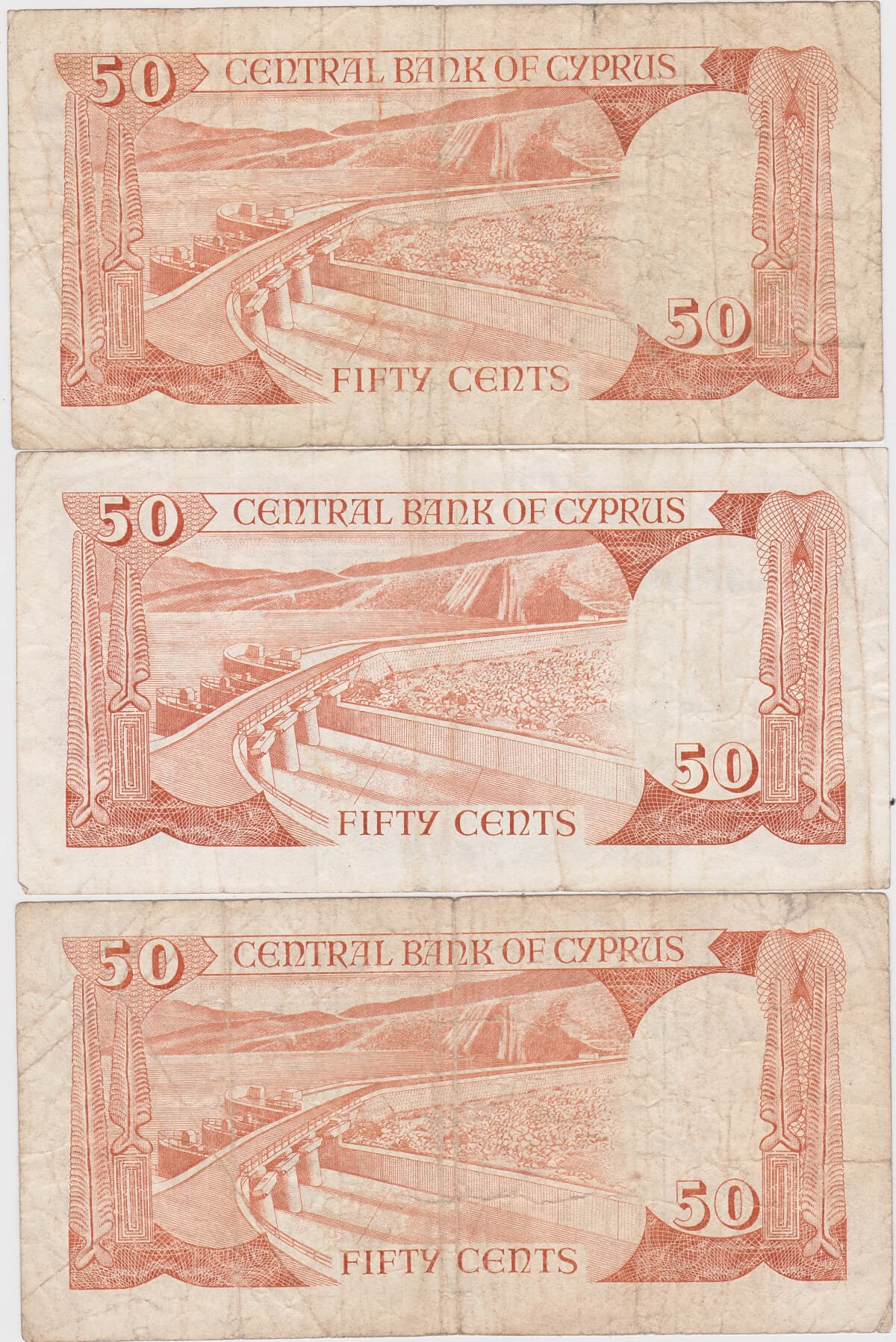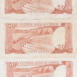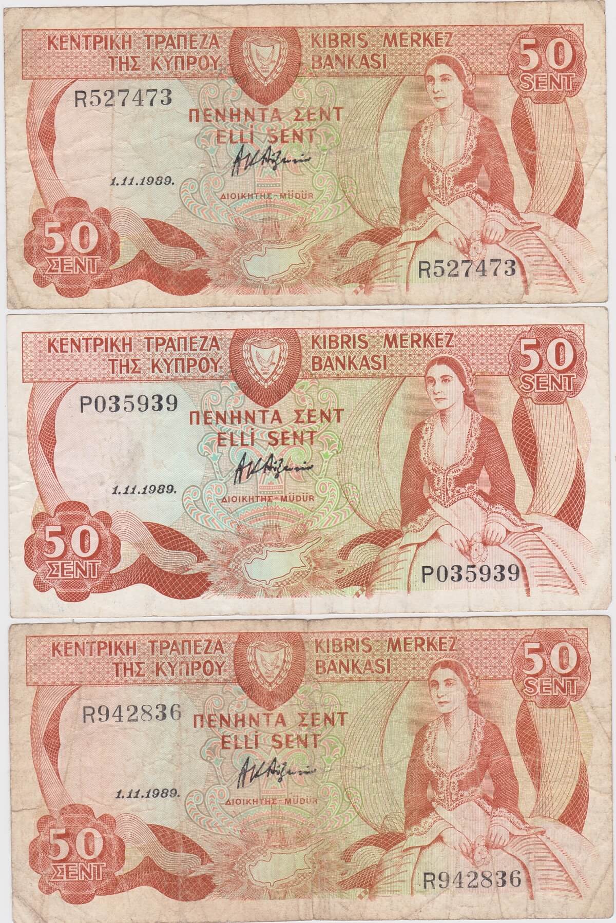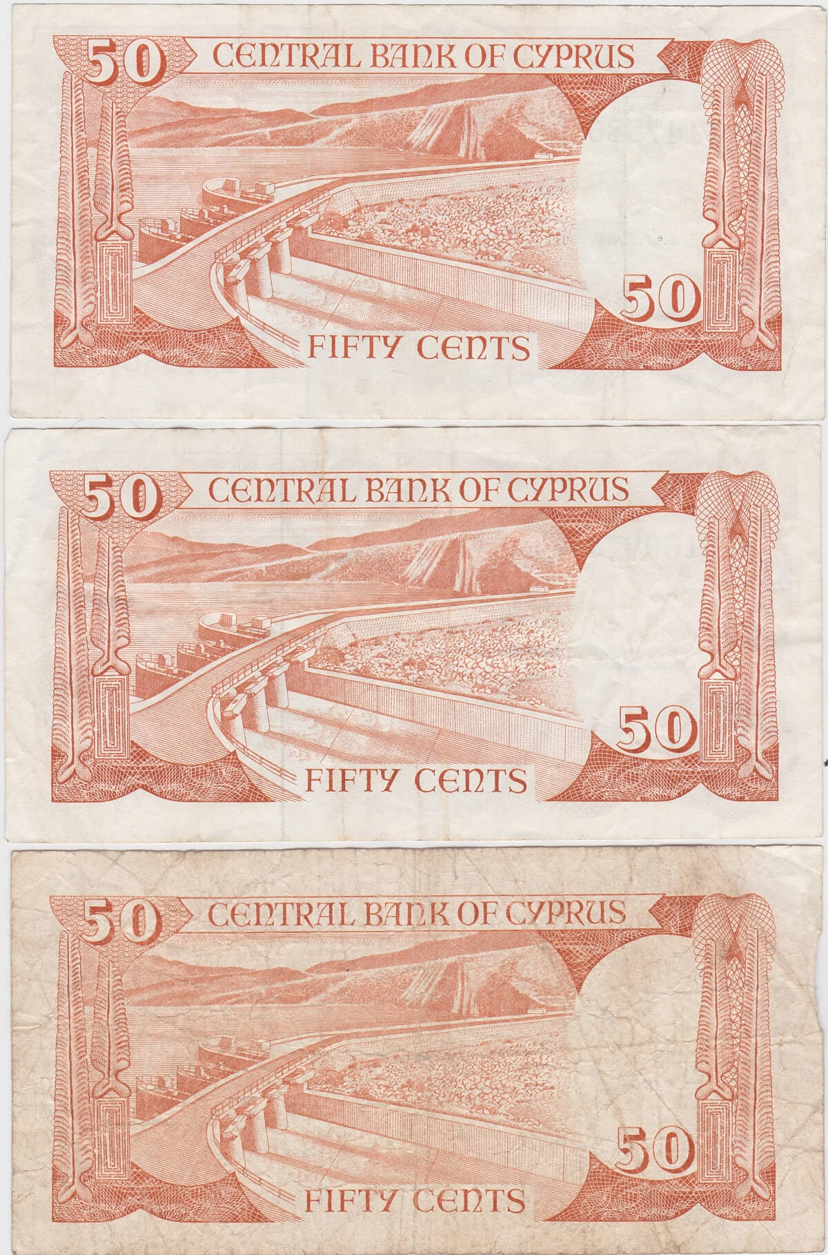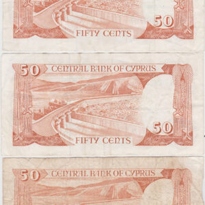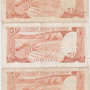 Nine P52 Cyprus Fifty Cents Banknotes. These fifty cents banknotes were issued between the 1st April 1987 and the 1st November 1989.Nine P52 Cyprus Fifty Cents Banknotes