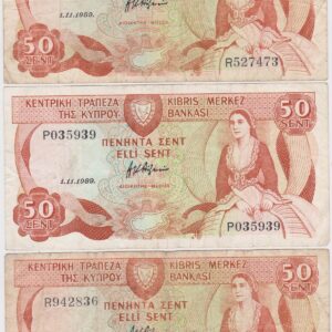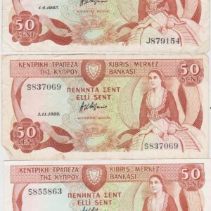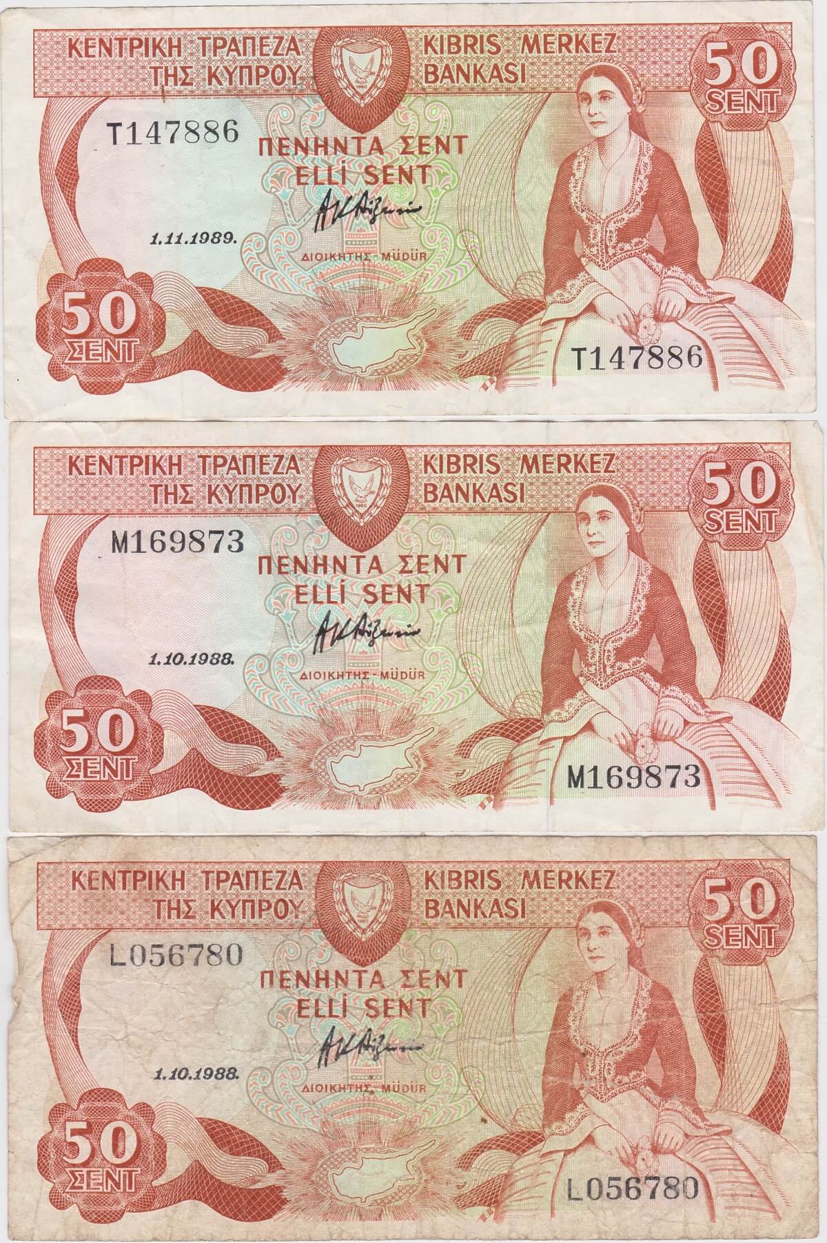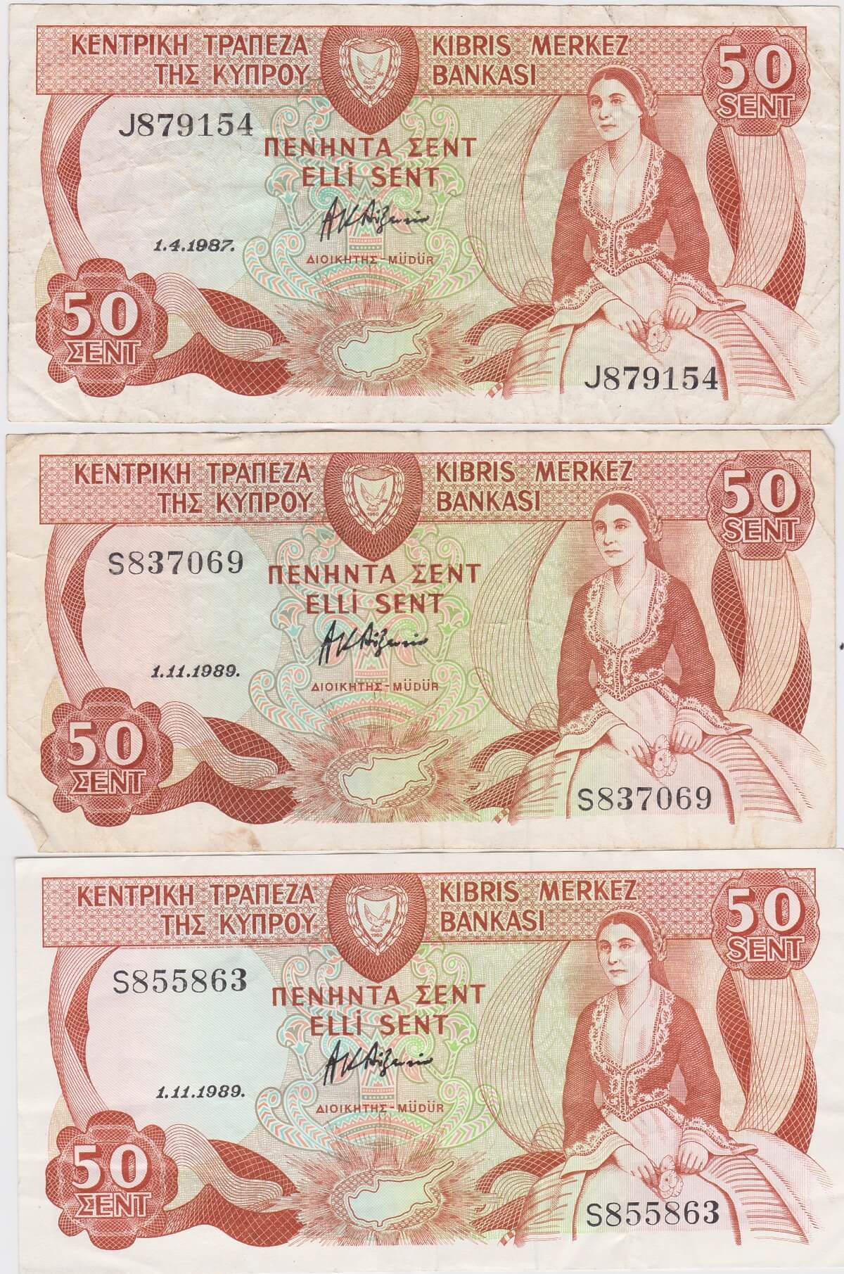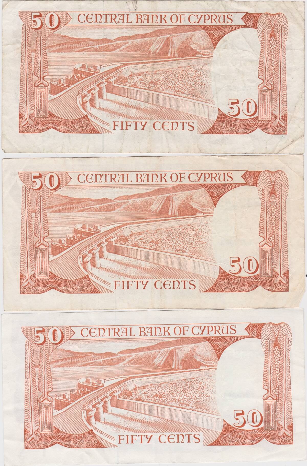Nine P52 Cyprus Fifty Cents Banknotes. These fifty cents banknotes were issued between the 1st April 1987 and the 1st November 1989.Nine P52 Cyprus Fifty Cents Banknotes