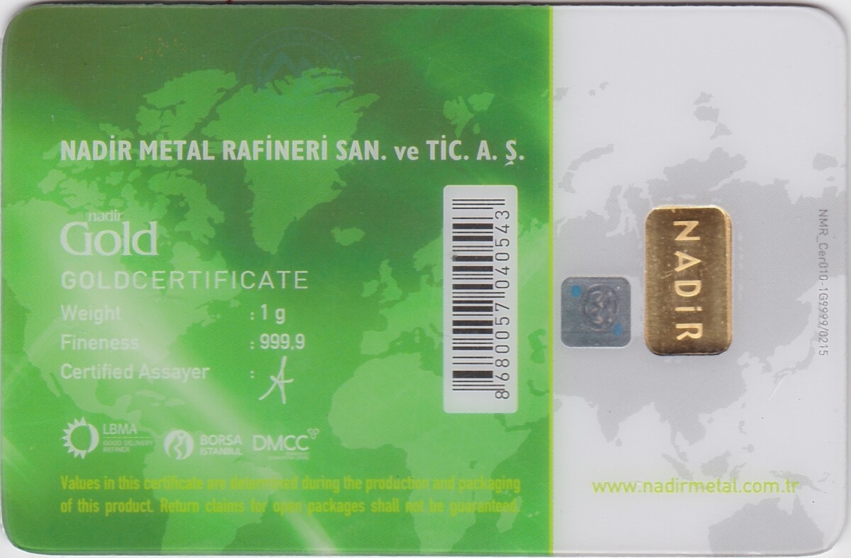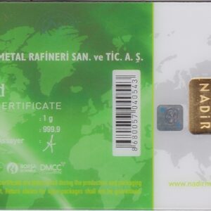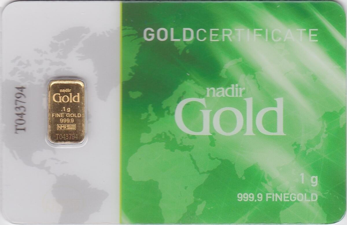 One Gram Gold Bar Nadir. This bar contains one grams of 999.9 fine gold refined by Nadir and comes presented in a sealed plastic packet.One Gram Gold Nadir Bar