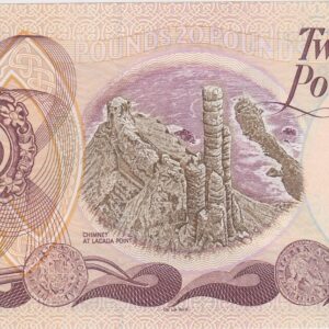 The reverse features the Chimney at Lacada point at the centre. Two Spanish coins and a Blacksmiths forging tool along the bottom. A large 20 filled with Celtic patterns and a small 20 set within an ornate broach complete the design.