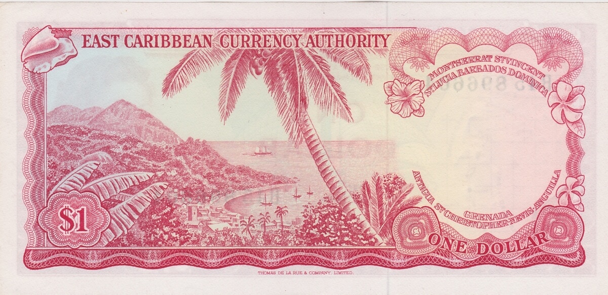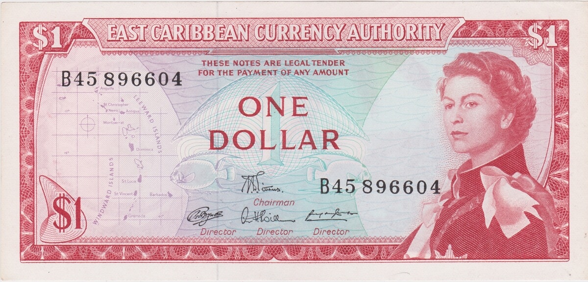 P13d East Caribbean States One Dollar Banknote. This one dollar banknote was issued in 1965, with Prefix / Serial Number B45 896604 with signature number 7.P13d East Caribbean States One Dollar Banknote