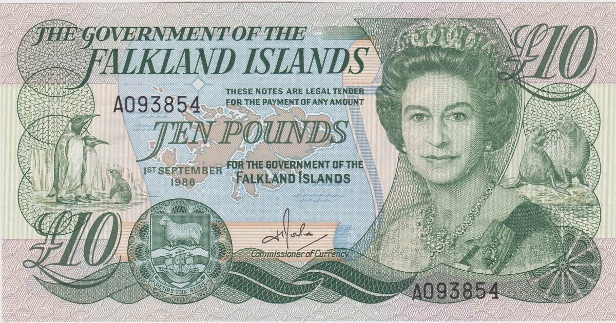 P14a Falkland Islands Ten Pounds Banknote. This ten pounds banknote was issued on the 1st September 1986, with Prefix / Serial Number A093854.P14a Falkland Islands Ten Pounds Banknote