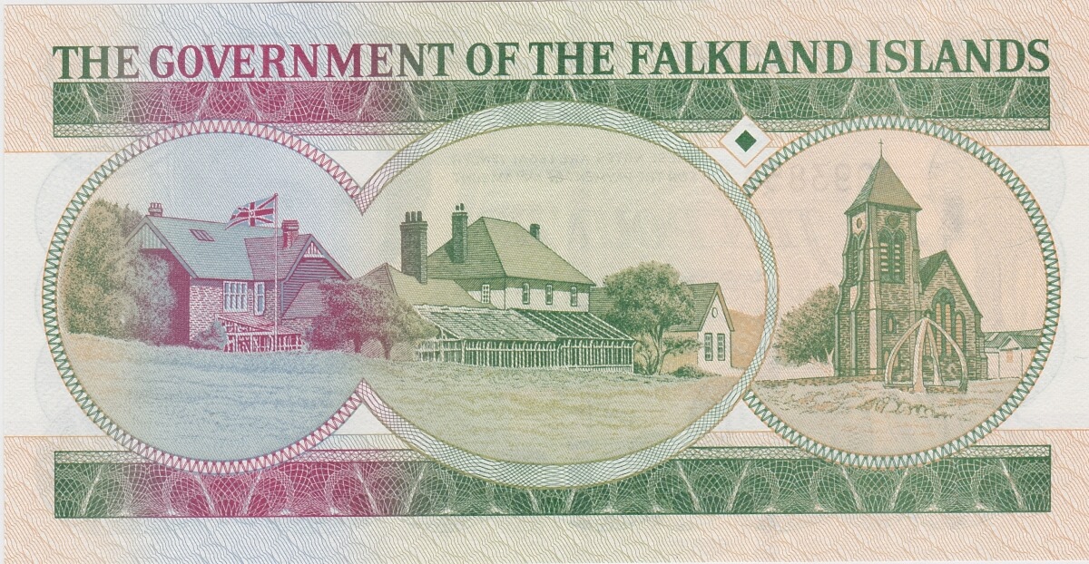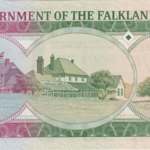 This Falkland Islands banknote is green on blue and multicolour underprint. The obverse features Queen Elizabeth II at the right, with King Penguins at the left. The reverse features the government house and the Cathedral in Stanley.