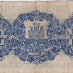 This Gibraltar banknote is blue on yellow-brown underprint. The note features the Rock of Gibraltar at the left on the obverse. The reverse features the arms in centre.