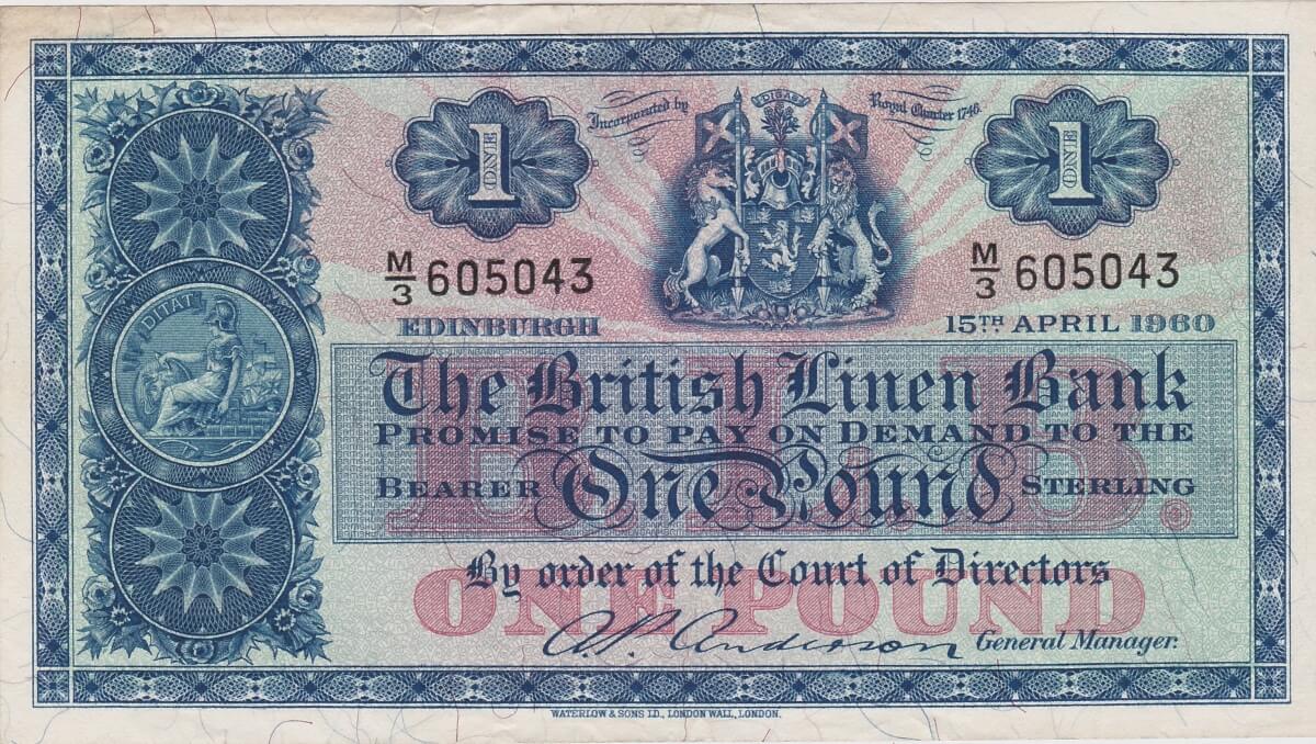 You are buying the P157e British Linen Bank One Pound Banknote in the pictures.