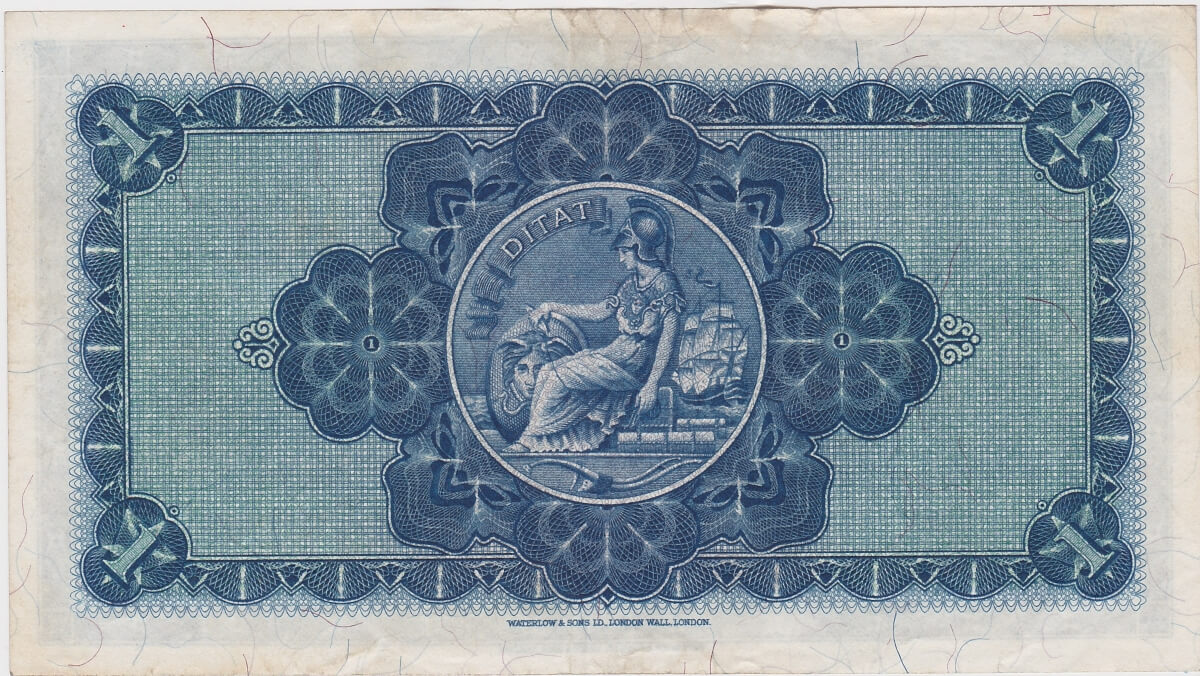 This British Linen Bank banknote features the bank arms at the top and seal at the left on the obverse. The reverse features the seal in the centre.