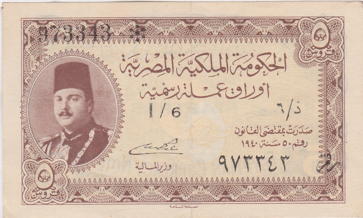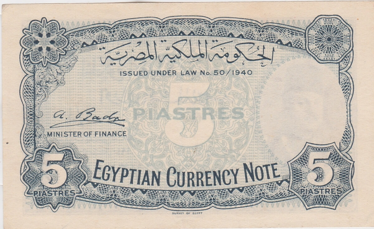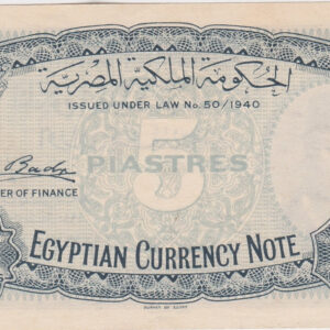 P165a Egypt Five Piastres Banknote. This five piastres banknote was issued in 1940. The prefix / serial number for this banknote I/6 973343.P165a Egypt Five Piastres Banknote
