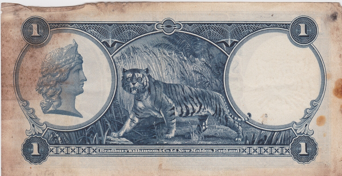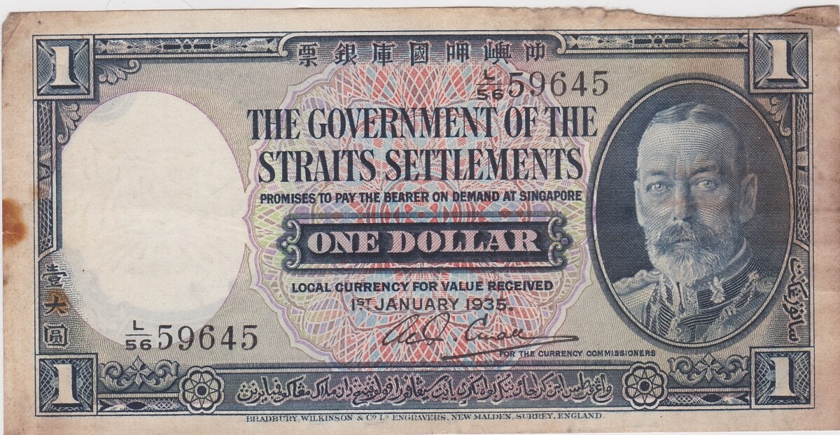 P16b Straits Settlements One Dollar Banknote. This one dollar banknote is dated 1st January 1935, with Prefix / Serial Number L over 56 59645.P16b Straits Settlements One Dollar Banknote