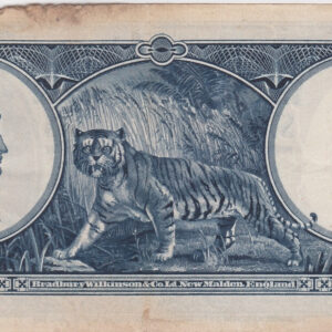 This Straits Settlements banknote is dark blue. The obverse features the portrait of King George V at the right. The reverse features the Allegorical head at the left with a tiger in the centre.
