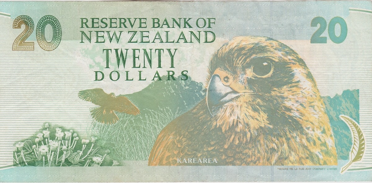 This New Zealand banknote is green on multicolour underprint. The obverse features Queen Elizabeth II at the centre, with the Parliament building at the left. The reverse depicts a Karearea (New Zealand falcon) in front of Mount Tapuaenuku at the centre. Marlborough Rock daisy at bottom left.
