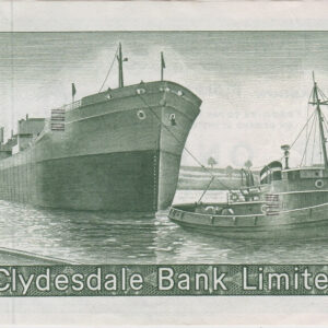 This Clydesdale Bank Limited banknote features the value to the left, and the coat of arms to the right on the obverse. The reverse features a ship with tugboat in docks.