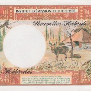 This New Hebrides banknote has red traditional patterns, a woman with flowers in her hair, and a hut with palm trees on the obverse. The reverse features red traditional patterns, a church, birds, deer, a hut, and wooden totem.