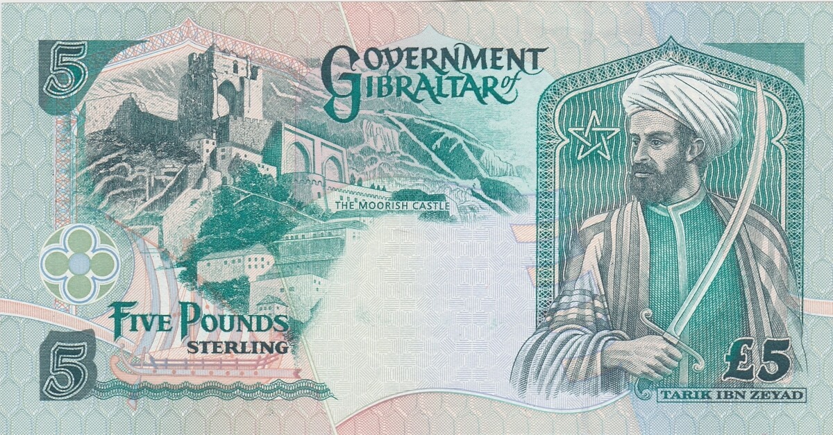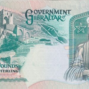 This Gibraltar banknote is green and purple on multicolour underprint. The note features Queen Elizabeth II, and the arms of Gibraltar. The reverse features Moorish Castle and Tariq ibn Ziyad, Muslim commander who led the Islamic Umayyad conquest of Visigothic Hispania in 711–718 A.D. He led a large army and crossed the Strait of Gibraltar from the North African coast, consolidating his troops at what is today known as the Rock of Gibraltar.