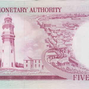 This Bermuda five dollars is red print, with multicolour underprint and black serial numbers. The obverse features the bust of Queen Elizabeth II. A Shell and coat of arms of Bermuda at the centre, with flowers at the lower right. The reverse features St. David’s Lighthouse in Bermuda at the left, with the St. George harbour and watermark area at the right.