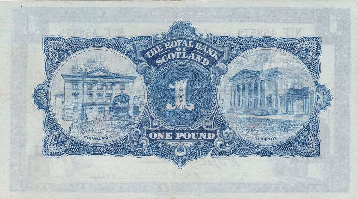 This Royal Bank Of Scotland banknote features a crest featuring George I at the top. Britannia at the bottom left. Plenty at the bottom right and a Printed signature on the obverse. The reverse features the Royal Bank of Scotland buldings in Edinburgh (left) and Glasgow (right)