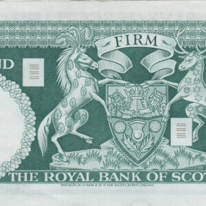 This Royal Bank Of Scotland banknote features the Forth Road Bridge with Forth Bridge (Railway) in background on the obverse. The reverse features the Bank arms and electronic sorting marks at the upper left and lower right.