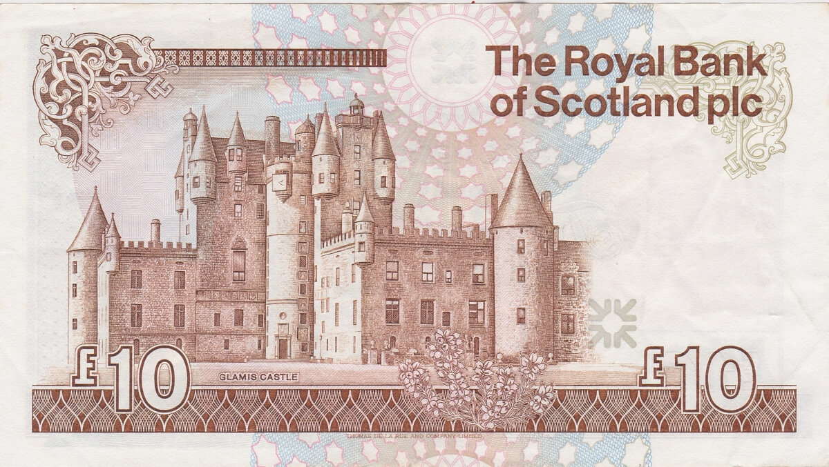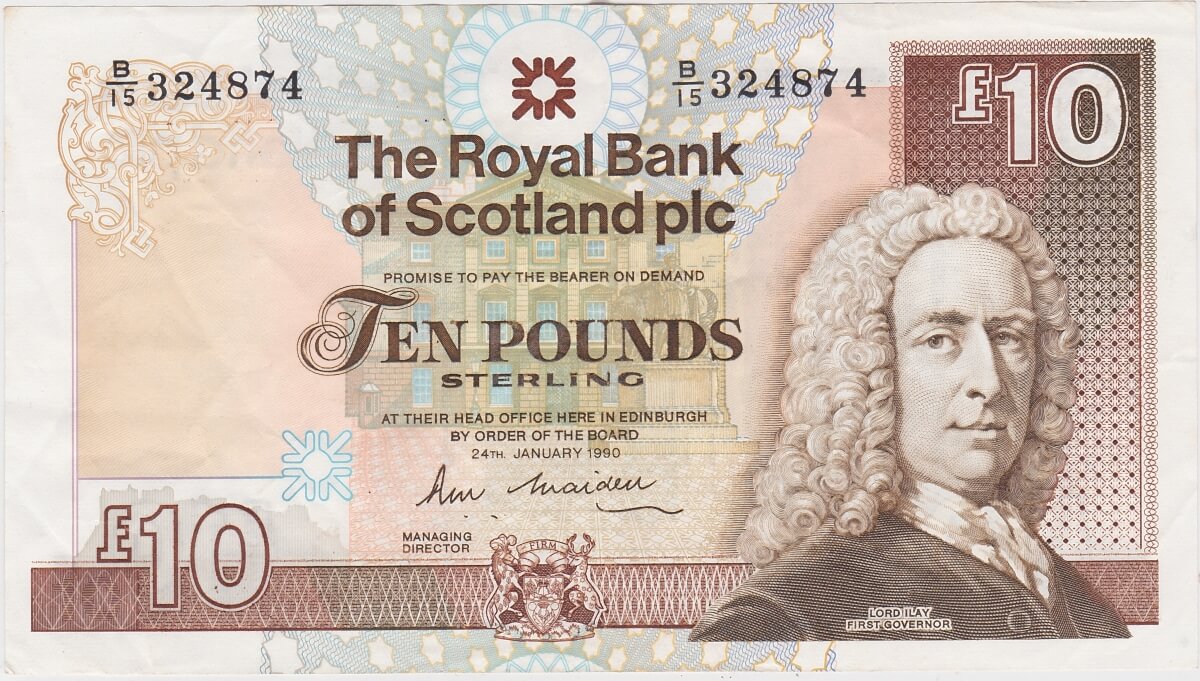 P348a Royal Bank Of Scotland Ten Pounds Banknote. This ten pounds banknote is dated the 1st January 1990, with Prefix / Serial Number B over 15 324874.P348a Royal Bank Of Scotland Ten Pounds Banknote