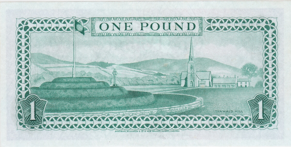 The obverse of this Isle Of Man banknote features Queen Elizabeth II at the right, with ISLE OF MAN GOVERNMENT at the top and the Isle of Man Three Leg Motif below. The reverse features a scenic View of Tynwald Hill.