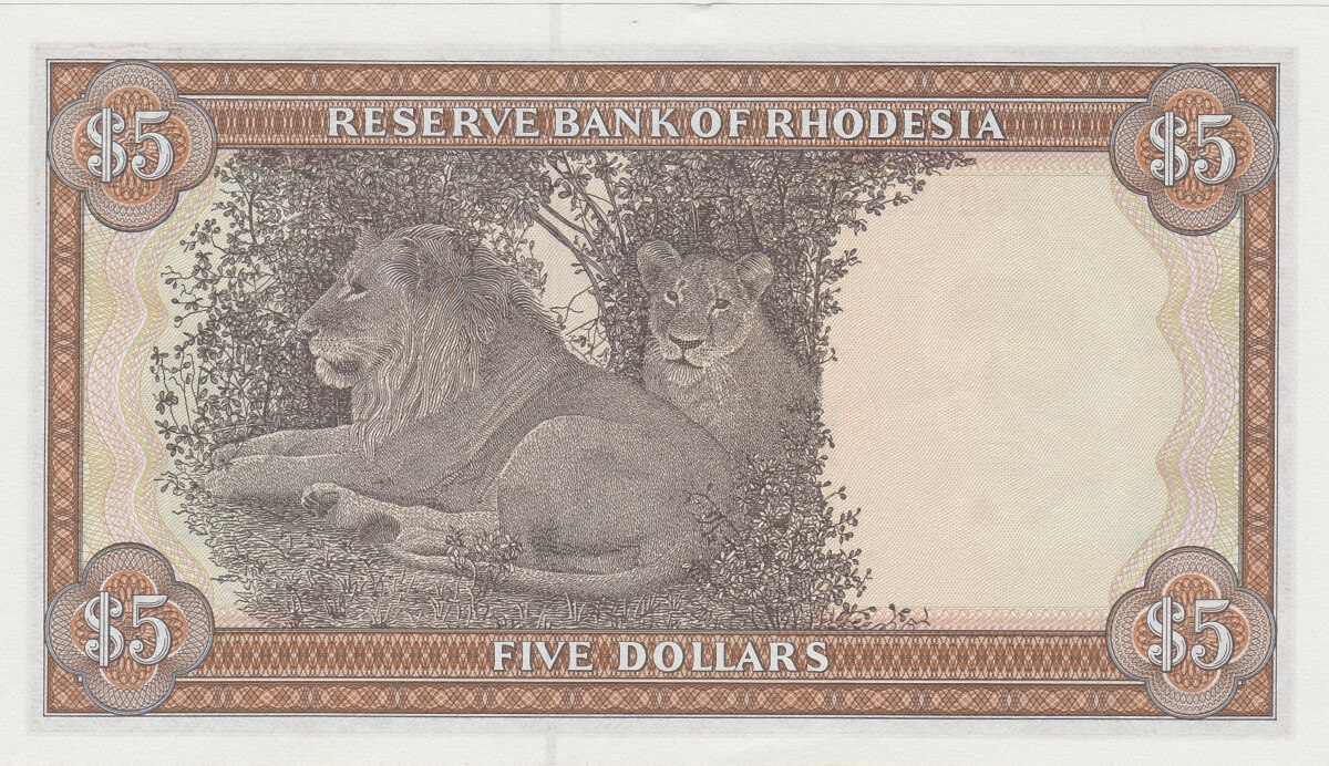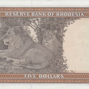 This Rhodesia banknote features the Reserve Bank of Rhodesia logo at the top centre, with the National Coat of Arms at the right, and Denomination in the centre, upper corners and lower right corner, and a giraffe in the lower left corner. The reverse features a lion and a lioness, with the denomination in each corner and in low centre.