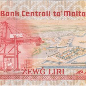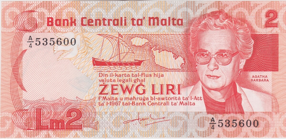 This Malta banknote features Agatha Barbara at the right and Phoenician sailing ship and map in centre. The reverse features Valletta Container Terminal.