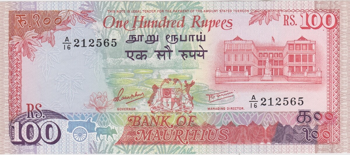 P38 Mauritius One Hundred Rupees Banknote. This one hundred rupees banknote was issued in 1986, with Prefix / Serial Number A over 16 212565.P38 Mauritius One Hundred Rupees Banknote