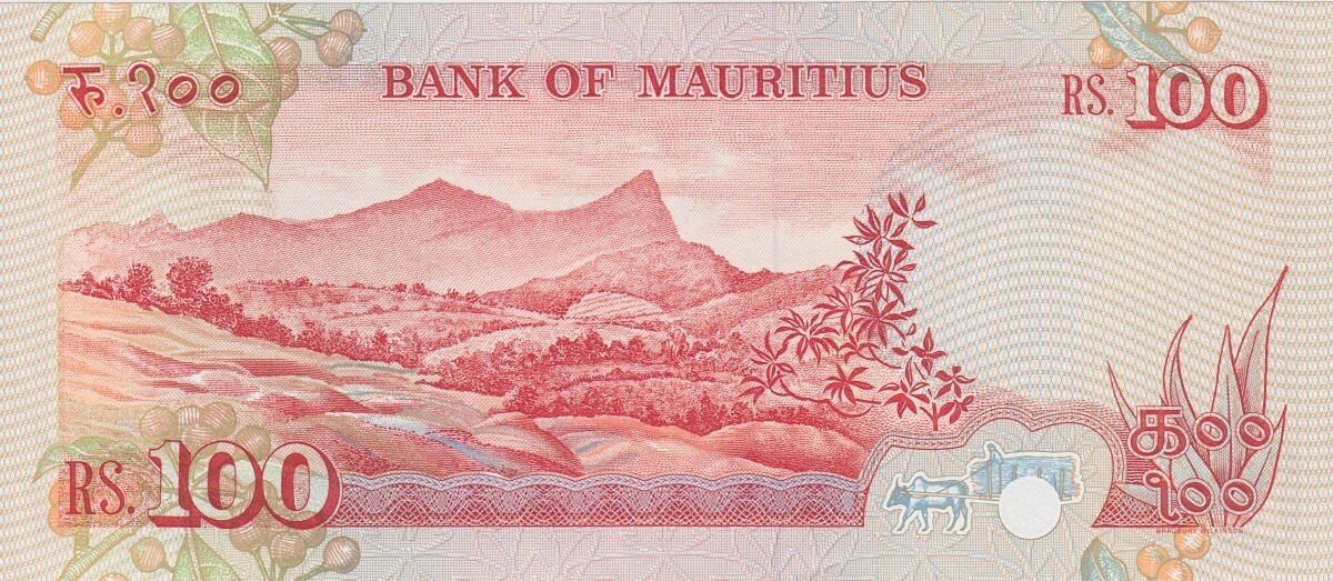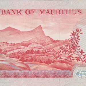 This Mauritius  banknote features statues of Queen Victoria and Sir William Stevenson in front of the Government House in Port Louis. The coat of arms of Mauritius is at the centre. The reverse features a landscape of the central plateau over Plaine Champagne and view of the mountain peaks of the Black River Gorges National Park.
