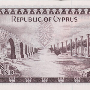 This Cyprus banknote features a Rosette, and arms, with script in Greek & Latin on the obverse. The reverse features a Roman viaduct near Larnaca & pillars at Salamis.