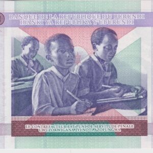 This Burundi banknote is red print on multicolour underprint with black and orange serial numbers. The obverse features the busts of Prince Rwagasore and President Ndadaye at the left. Coat of arms of Burundi at the centre, with a flag of Burundi at the top right. The reverse features three students in a classroom at the centre, the flag of Burundi in the background, and a Jug at the right.