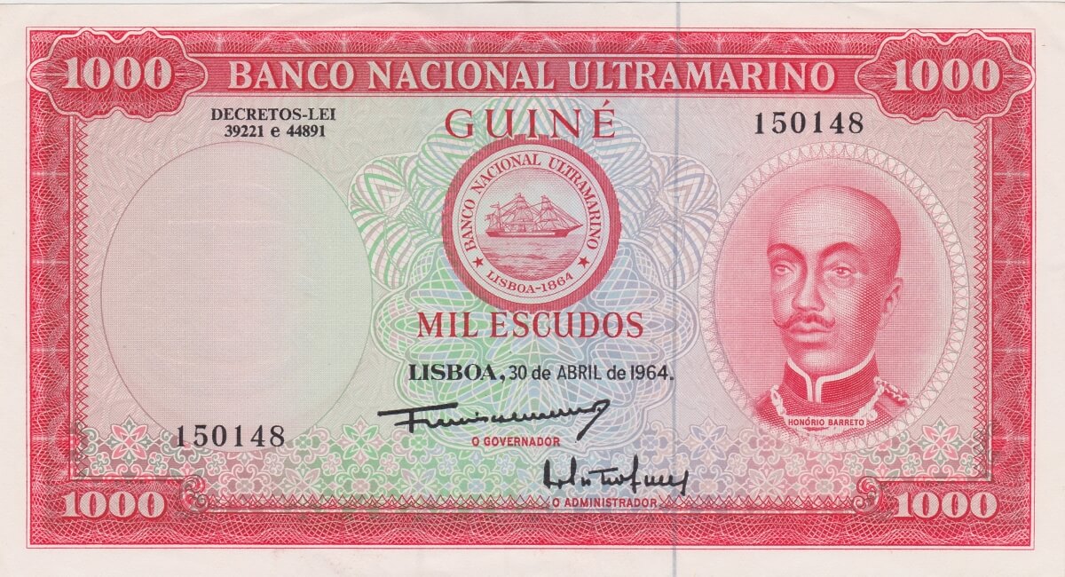 This one thousand escudos banknote was issued on the 30th April 1964, with Prefix / Serial Number 150148.