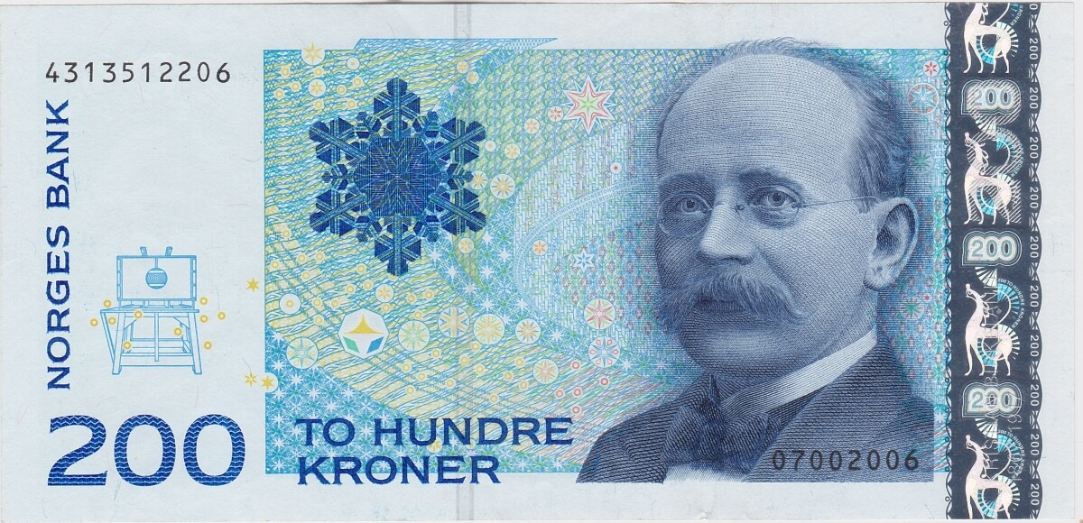 There is no writing, repairs, pin holes or damage on this two hundred kroner banknote.