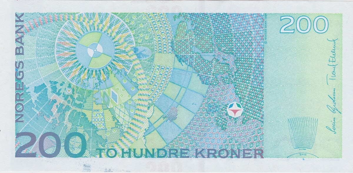 This Norway banknote is blue and green print. The obverse features the portrait of Kristian Birkeland on the right. The reverse is pale green and blue print. With the map of the North Pole with a compass rose.